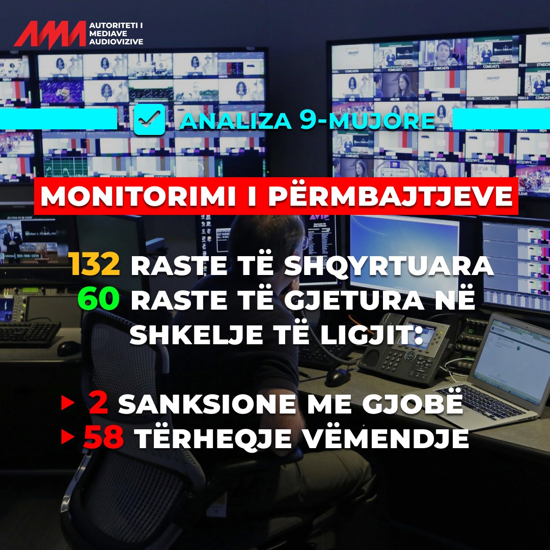 Në bazë të detyrave dhe funksioneve që ligji i njeh Autoritetit të Mediave Audiovizive (AMA)për monitorimin e përmbajtjeve audiovizive, institucioni ka zhvilluar bilancin 9-mujor të punës, duke vlerësuar përputhshmërinë ligjore të programeve të transmetuara nga operatorët televizivë në vend.