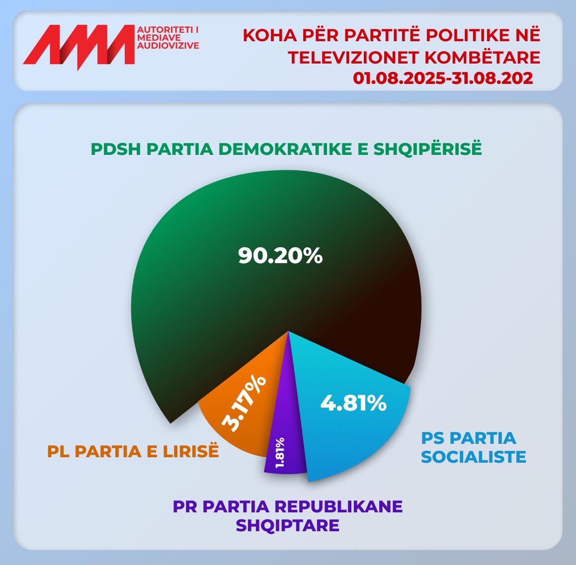 Kështu sipas të dhënave rezulton se Partia Demokratike e Shqipërisë ka zënë 90.20% të kohës në edicionet e lajmeve, pasuar nga Partia Socialiste me 4.81%. Pas tyre renditen Partia e Lirisë me 3.17% dhe ajo Republikane me 1.81%. Analizën e plotë e gjeni në https://ama.gov.al/monitorimi-i-permbajtjeve/