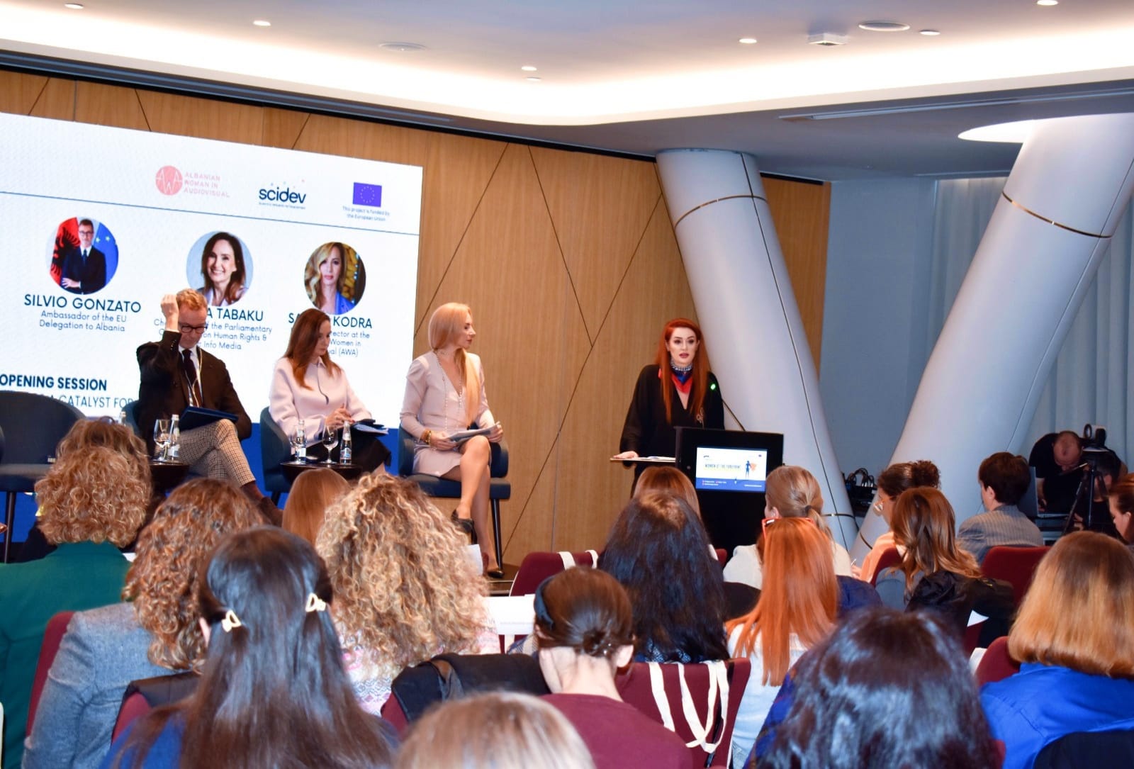 Në takim ishin të pranishëm ambasadori i BE në Tiranë, Z.Silvio Gonzato, deputetja e PD-së znj. Jorida Tabaku në cilësinë e kryetares së Komisionit për të Drejtat e Njeriut dhe Mjetet e Informimit publik, Dr. Blerjana Bino, drejtore ekzekutive e SCiDEV, Znj. Sabina Kodra, Drejtore Ekzekutive, Gratë në Audiovizual (AWA), Znj. Annette Young, gazetare dhe autore e emisionit “The 51 Percent” te “France 24 TV”, përfaqësues të shoqërisë civile, gazetarë etj.