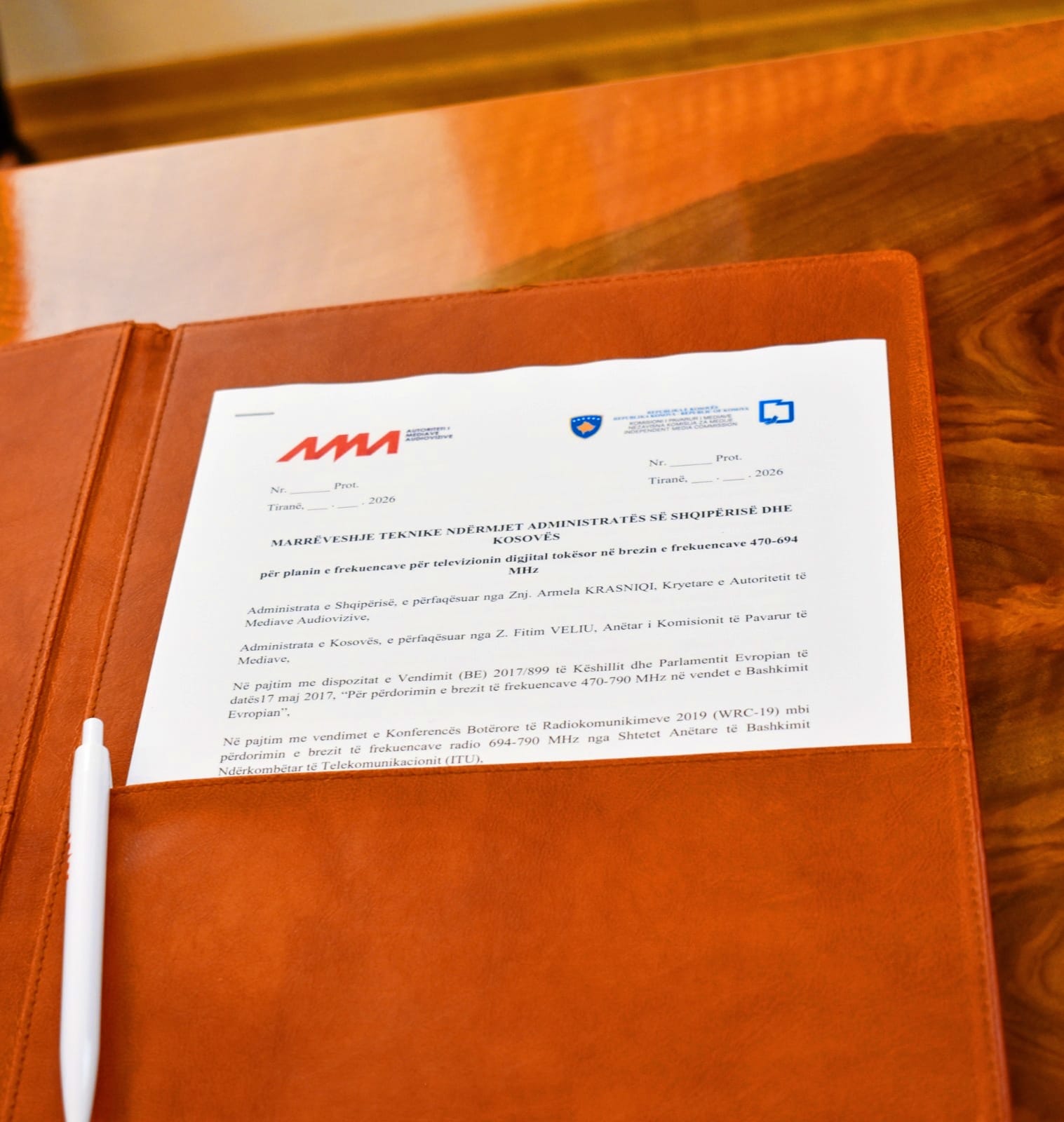 Znj. Armela Krasniqi, Kryetare e Autoritetit të Mediave Audiovizive dhe z. Fitim Veliu, anëtar i Komisionit të Pavarur të Medias së Kosovës, nënshkruan në Tiranë marrëveshjen teknike për koordinimin e planit të frekuencave për transmetimet televizive digjitale tokësore (DDT), në brezin 470–694 MHz.