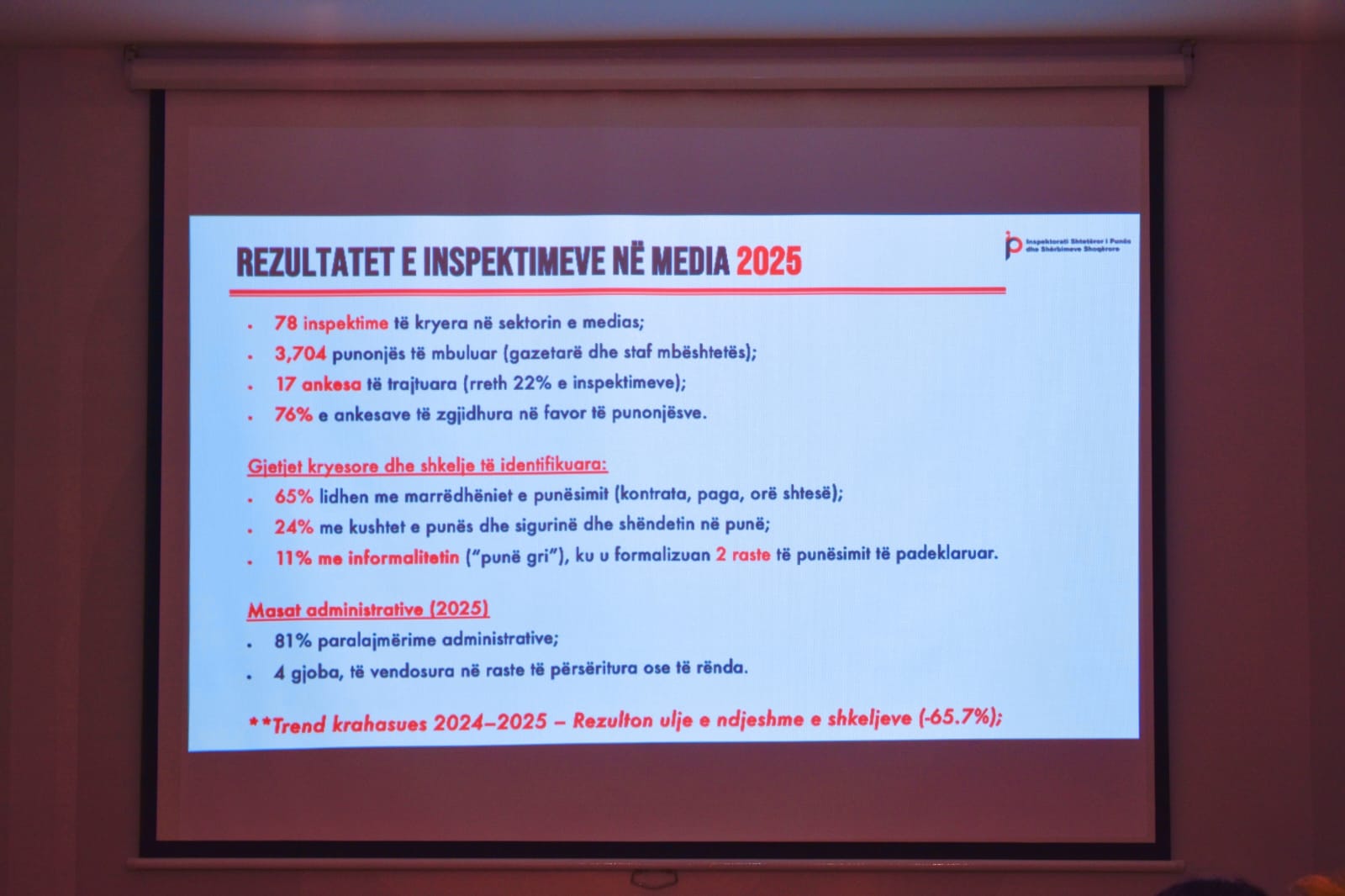 Sipas të dhënave të prezantuara nga kreu i Inspektoratit, sektori mediatik mbetet një treg dinamik dhe njëkohësisht sfidues. Gjatë vitit 2025, ankesat e trajtuara që lidhen me median përbënin rreth 22% të totalit të inspektimeve, ndërsa 76% e tyre janë zgjidhur në favor të punonjësve, tregues që evidenton efektivitetin e inspektimit dhe rëndësinë e bashkëpunimit institucional në mbrojtjen e të drejtave të punës.